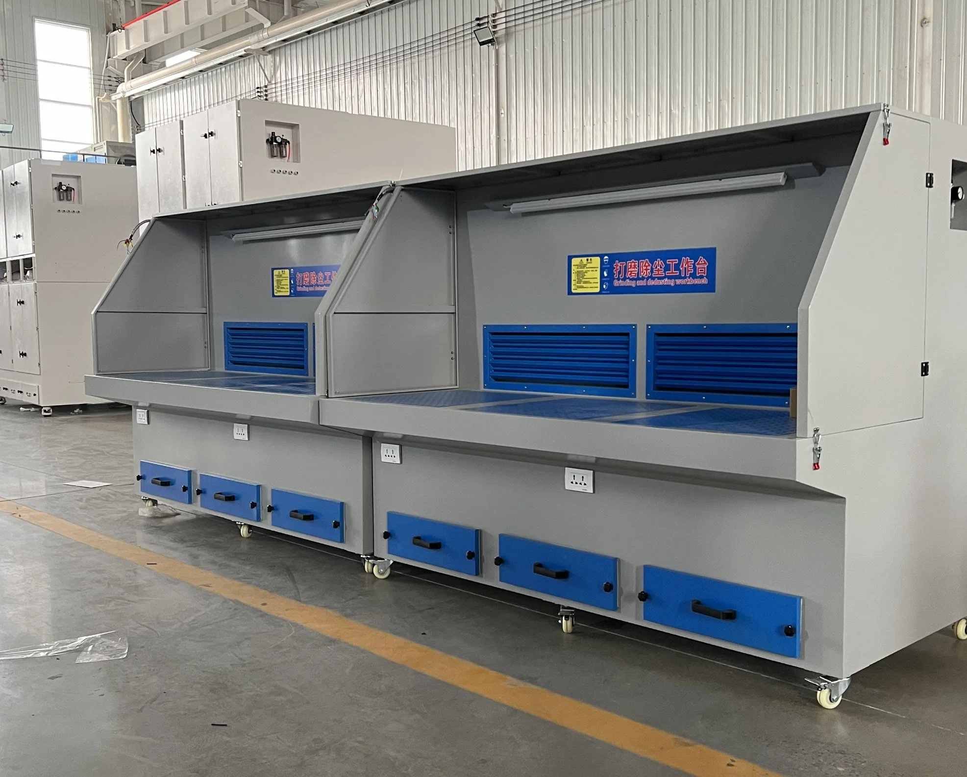 - நல்ல தூசி சேகரிப்பு விளைவு:நுண்ணிய உலோகத் துகள்கள் உட்பட இயந்திர செயலாக்கத்தில் உருவாகும் வெவ்வேறு துகள் அளவுகளின் தூசிக்கு, தூசி சுற்றியுள்ள சூழலில் வெளியேறாமல் இருப்பதை உறுதிசெய்ய நல்ல சேகரிப்பு திறனைக் கொண்டிருக்க வேண்டும். வொர்க் பெஞ்சின் கீழ், முன் மற்றும் மேற்பகுதியில் காற்று நுழைவாயில்கள் இருக்க வேண்டும், மேலும் தூசியின் பறப்பதை திறம்பட கட்டுப்படுத்தவும் மற்றும் அனைத்து சுற்று தூசி சேகரிப்பை அடையவும் காற்று நுழைவாயில்களின் தளவமைப்பு நியாயமானதாக இருக்க வேண்டும்.